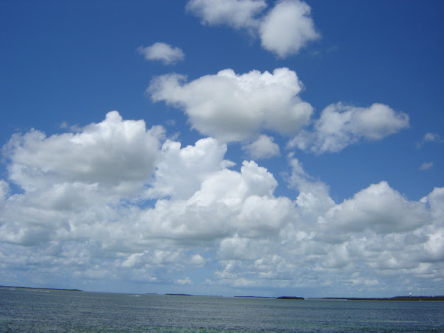 | Typical view on miles of the drive up and down the Florida Keys. Looking out to the low lying island chain off the coast. Narrow strip of road and then miles of ocean. |